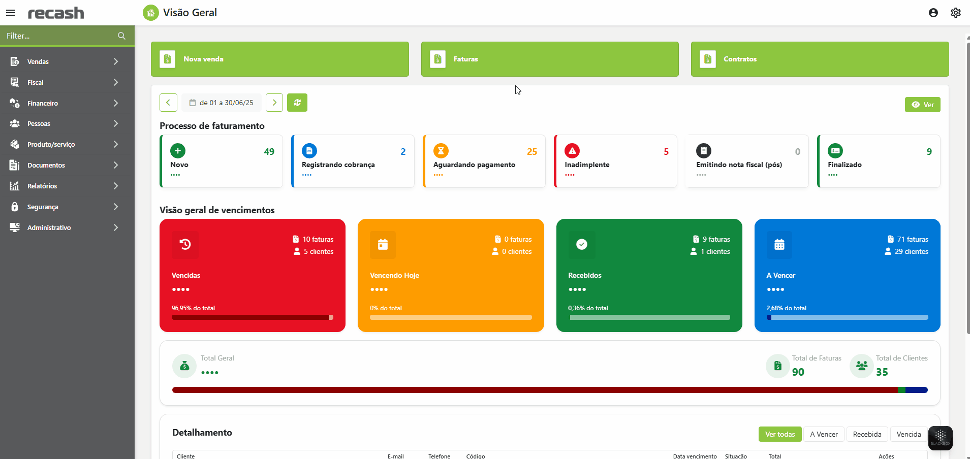 Ao clicar em um desses quadros, você será direcionado para a janela Faturas, onde um filtro já estará aplicado para exibir apenas as faturas correspondentes ao status selecionado.