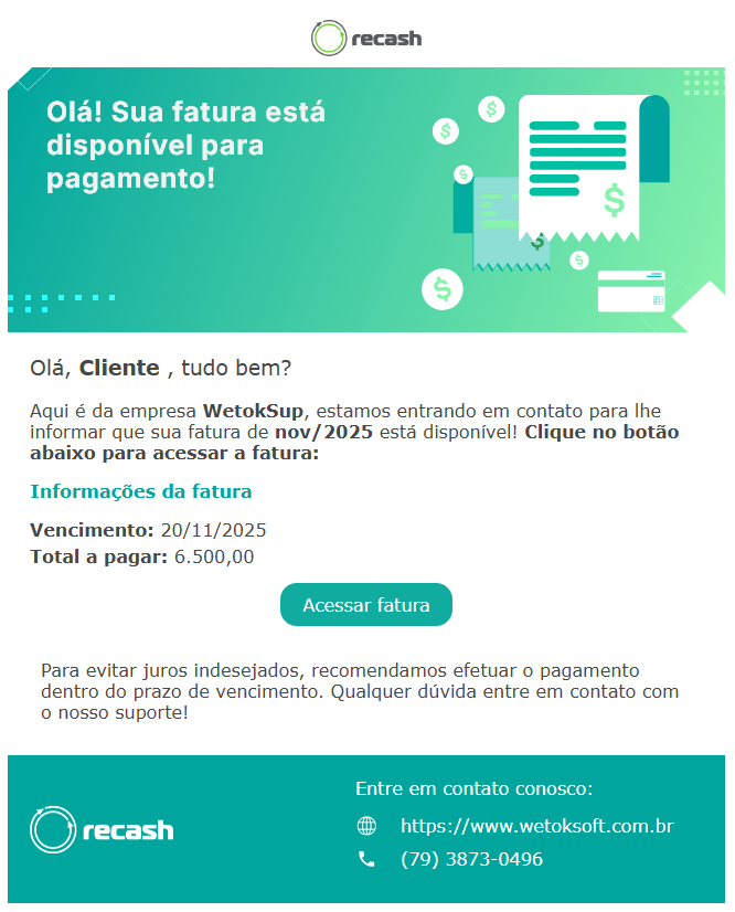 O Recash oferece um sistema de régua de cobrança totalmente configurável, adaptando-se às necessidades da sua empresa. Assim que uma cobrança é gerada, o sistema inicia automaticamente o envio de e-mails e SMS para garantir que o cliente esteja informado sobre seus compromissos financeiros.