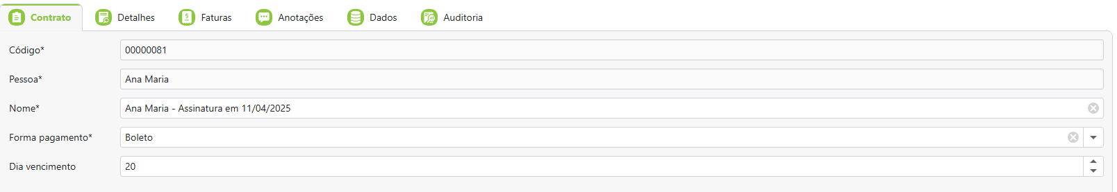 - Pessoa vinculada: Indica o titular do contrato, podendo ser um cliente, colaborador ou fornecedor.