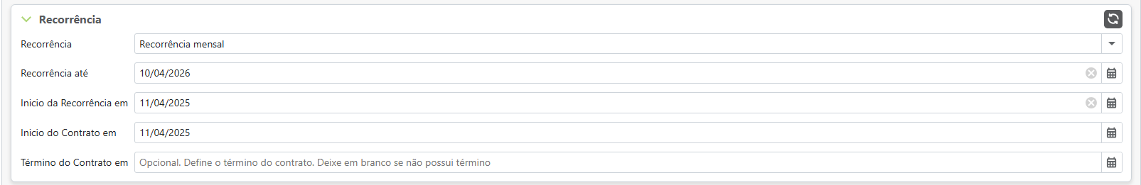 - Início da recorrência: Data a partir da qual os pagamentos recorrentes começam a ser contabilizados.