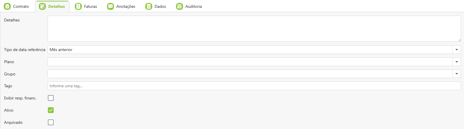 - Opções de Ativação e Arquivamento: É possível ativar ou desativar o contrato utilizando a tag correspondente, além da opção de arquivamento, que permite armazenar contratos inativos para consulta futura.