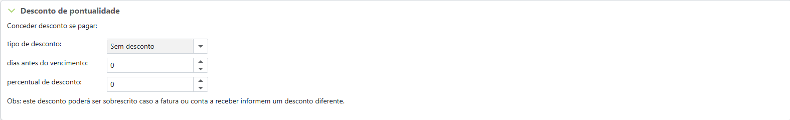 Esse desconto pode ser configurado conforme a necessidade da organização, permitindo ajustes no prazo para concessão do benefício e no percentual de redução do valor. Vale destacar que, caso uma fatura ou conta a receber tenha um desconto específico informado, a configuração pode ser sobrescrita.