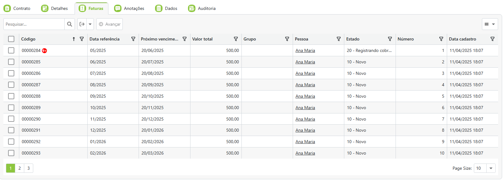 A aba Faturas exibe todas as cobranças geradas dentro do contrato, permitindo um acompanhamento detalhado sobre seus status, datas de pagamento e quantidade de faturas pendentes.