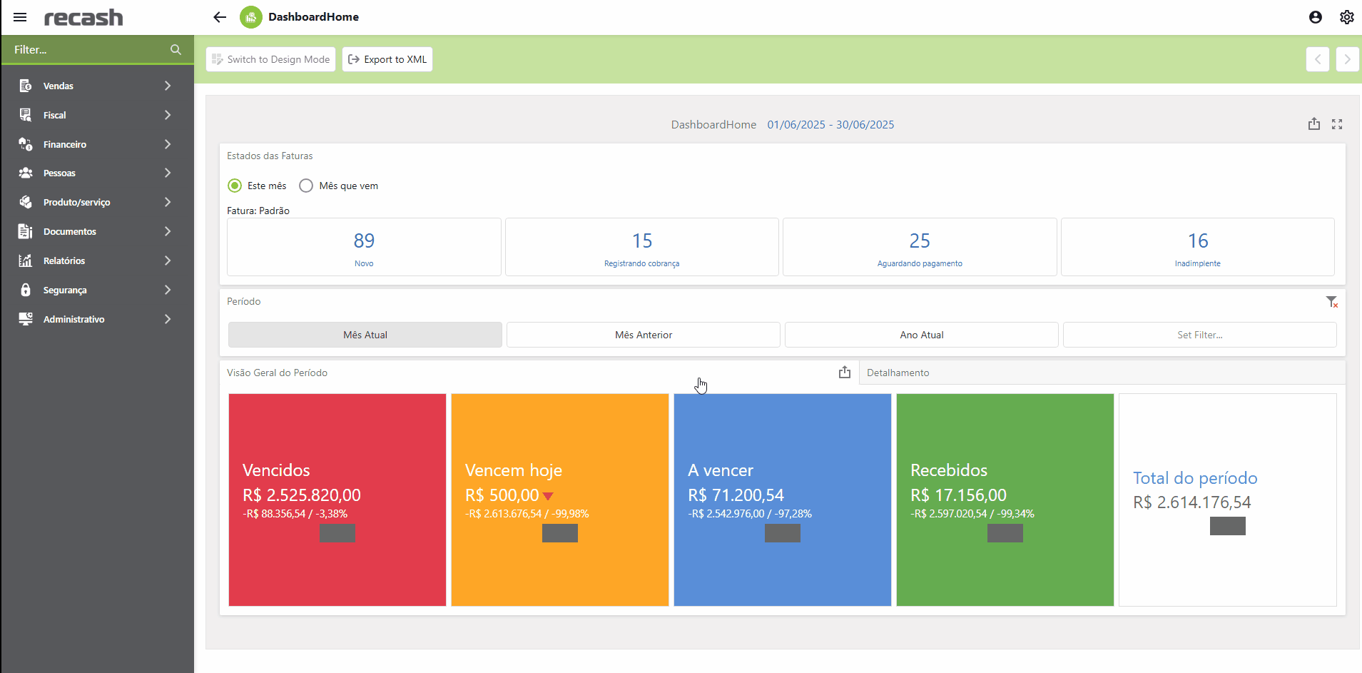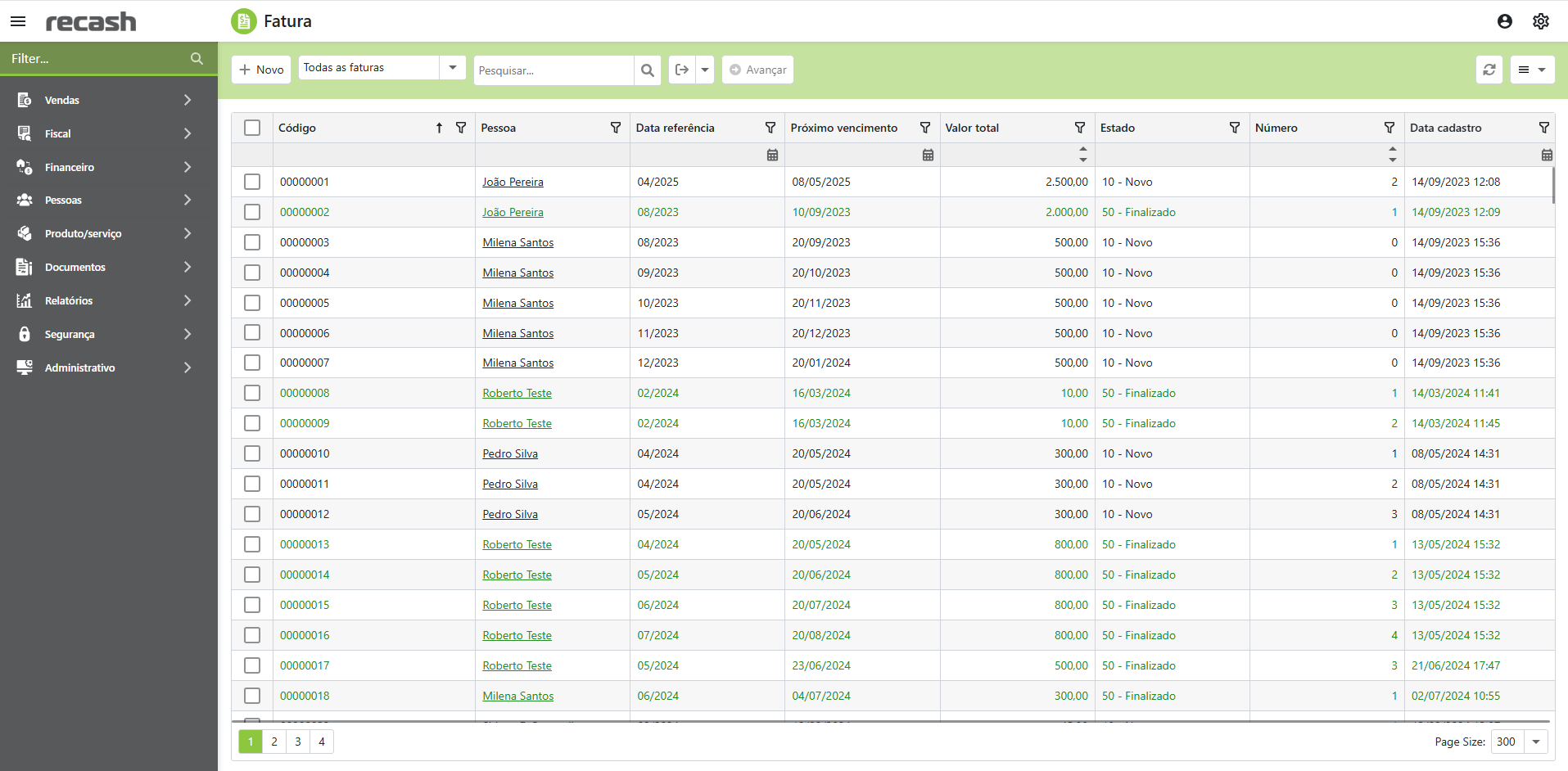 Em algumas telas do Recash como por exemplo “Faturas, contratos, pessoas”